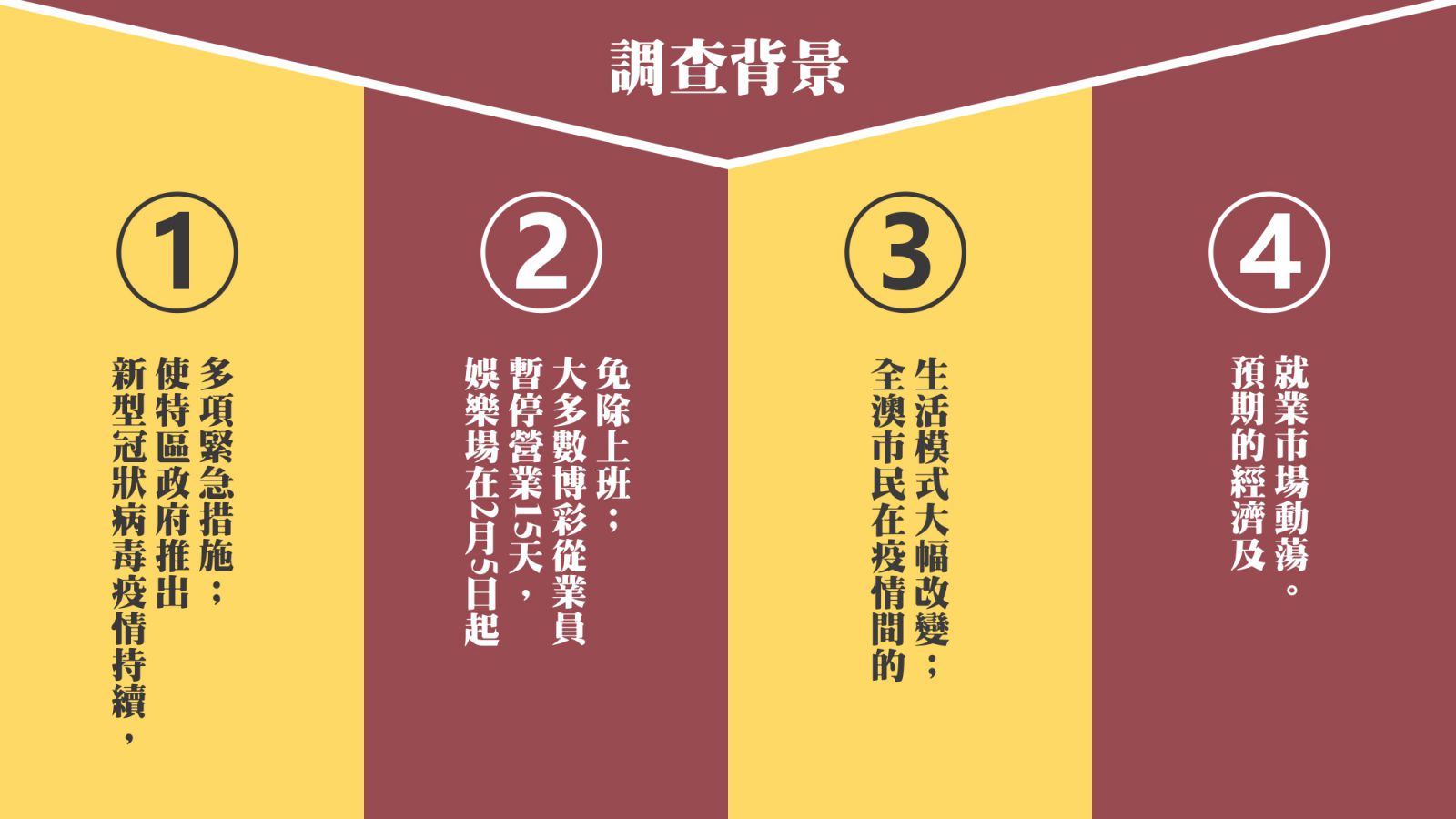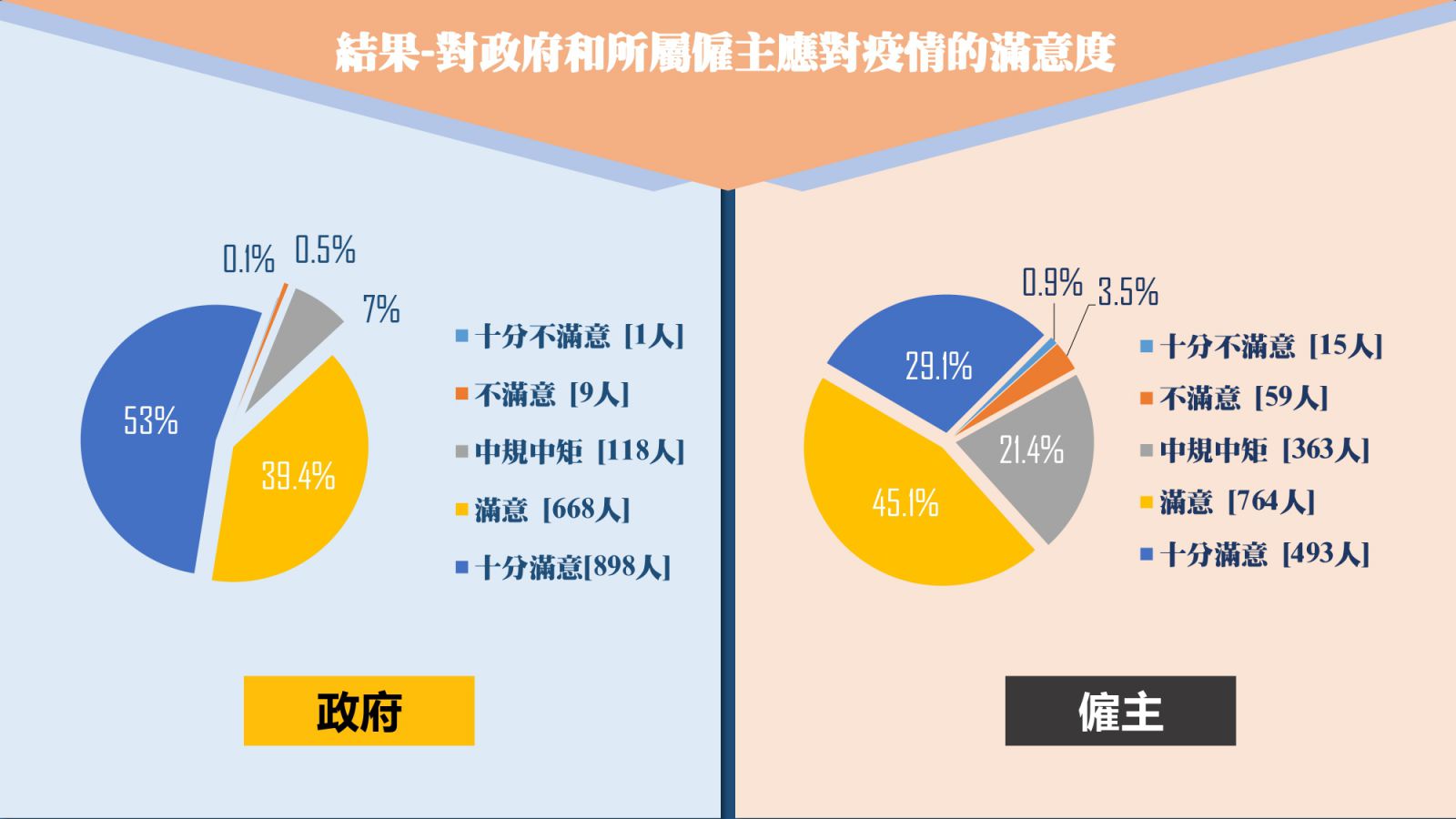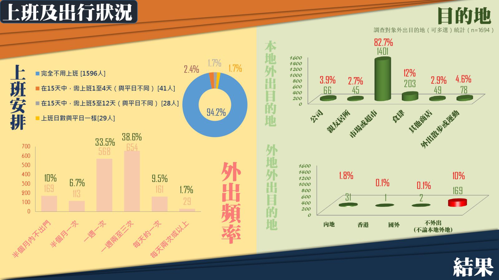 調查發現分別有92.4%和74.2%的受訪者對政府和僱主應對疫情的表現表示滿意或十分滿意。在上班及出行狀況方面,有94.2%受訪者表示自己在2月5至19日娛樂場停運期間完全不需上班;10%的受訪者選擇在停運期間完全不外出,72.1%受訪者表示一週外出一至三次;82.7%的受訪者表示會在停運期間到市場或超市購物,它為受訪者外出的首要原因。