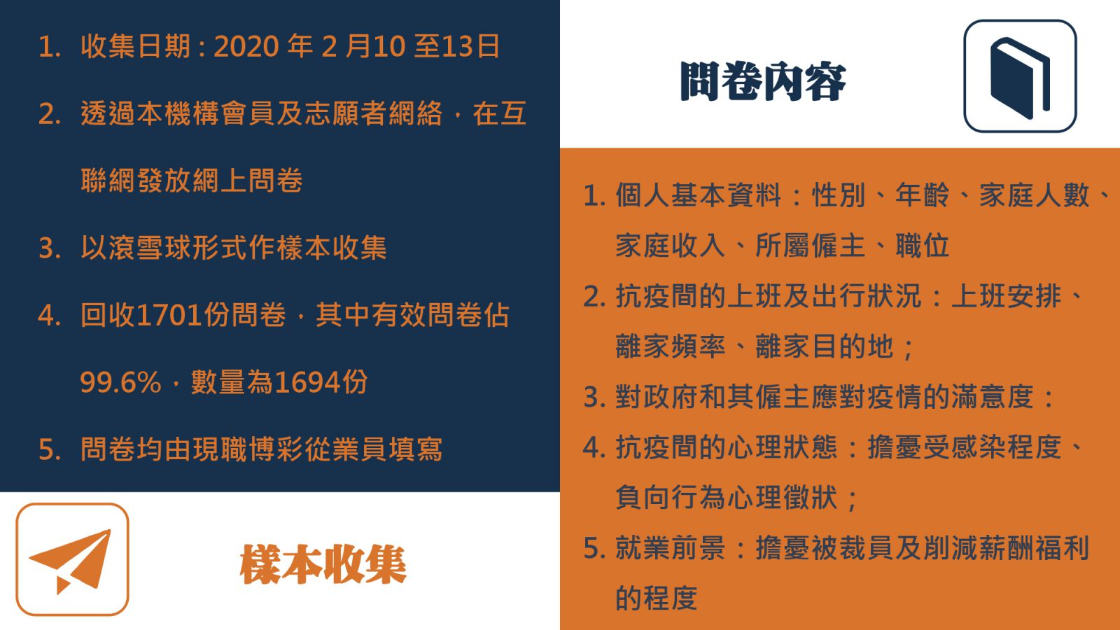 為了解博彩從業員在2月5日娛樂場停運後的上班出行狀況、心理狀態及對就業前景的看法,博彩業職工之家於2月10至13日進行<<博彩從業員抗疫期間的心理狀態調查>>,共於網上收集到1,694份由現職博彩從業員填寫的有效問卷。主要由荷官、賭場主任以及區域經理填寫,分別佔總人數的63.7%、20.6%以及4.5%,其他職位的參與人士則佔11.2%。