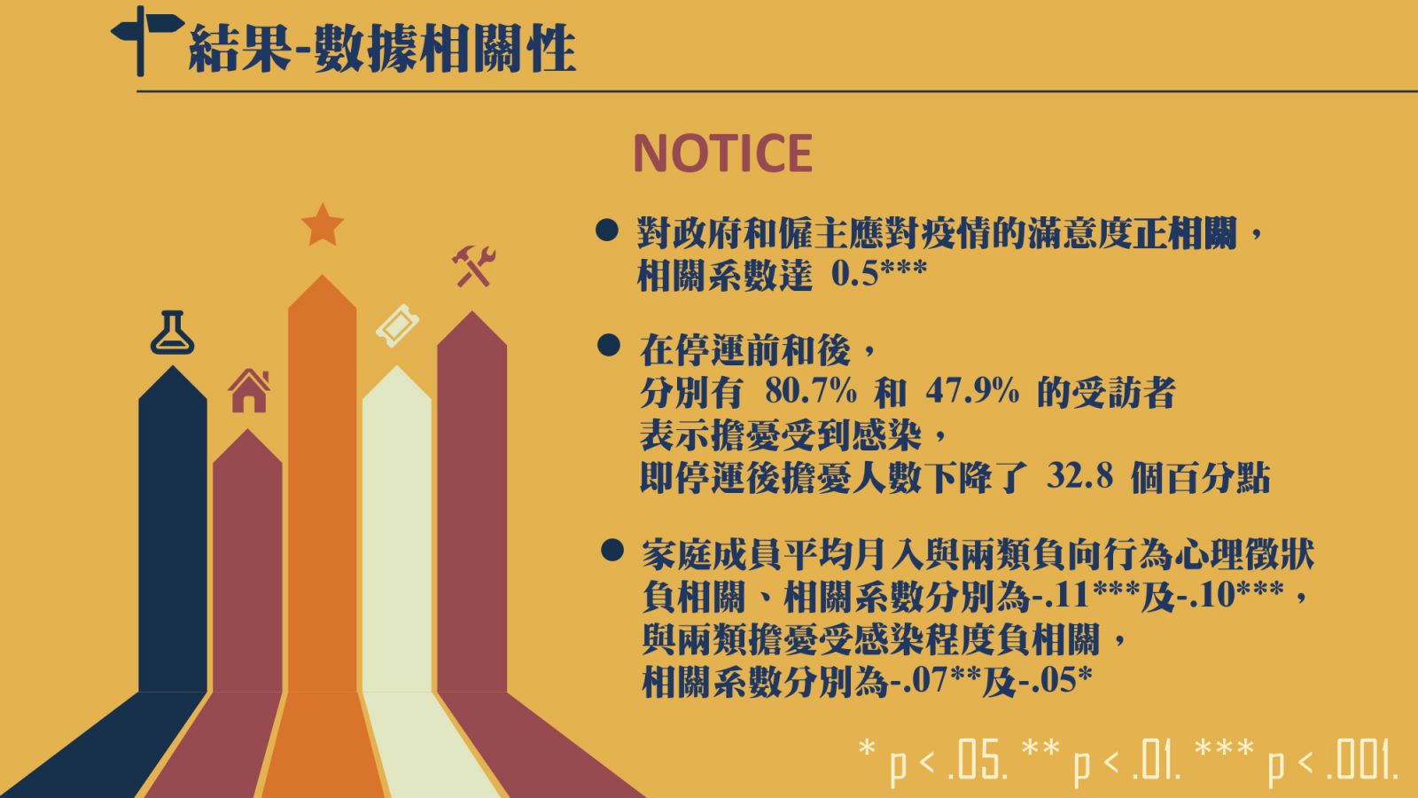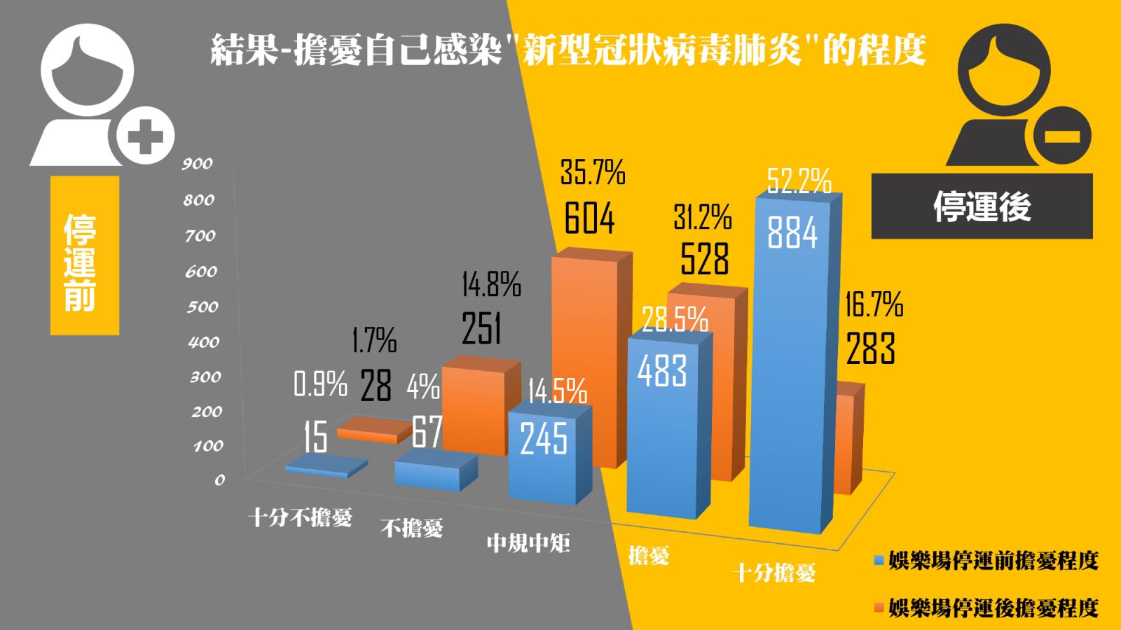 博彩從業員對在疫情期間受新型冠狀病毒感染表示擔憂,但擔憂人數隨娛樂場停運顯著下降;在停運前,擔憂及十分擔憂受到感染的總受訪者有80.7%,而停運後僅有47.9%,即停運後擔憂及十分擔憂受感染的受訪者共下降了32.8個百分點。博彩從業員在疫情中的心理健康狀態異常狀況普遍,分別有46.6%和38.2%的受訪者認為自己在過去一週長期處於精神緊張狀態,和因不能自制地獲取疫情信息而引發負面情緒。