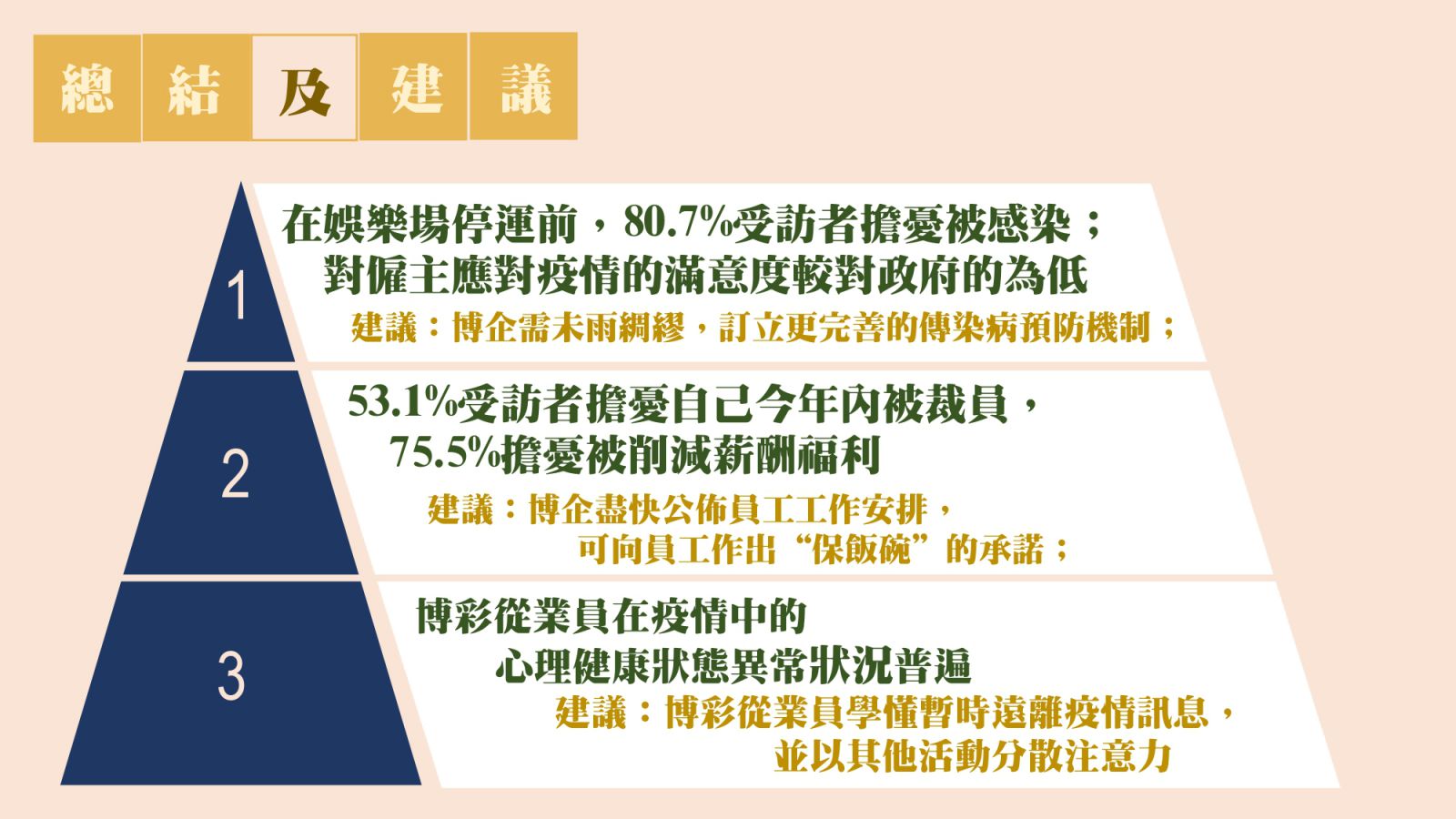 博彩業職工之家就調查結果提出以下意見:1.) 博企需訂立更完善的傳染病預防機制,在澳門已經或有機會爆發大規模傳染病時立即提升員工的防護措施,加強對賭客的健康檢查,並確保有足夠的防疫物資儲備;2.) 博企盡快公佈後續的員工工作安排,並在有條件下向員工作出不裁員的承諾,讓員工對前程有更好的規劃;3.) 由於網上經常流傳不實的資訊,呼籲從業員要遠離及不要輕易相信未經證實的資訊。