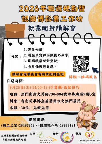 現職博彩從業員及有興趣之人士,每場限10人(先到先得)