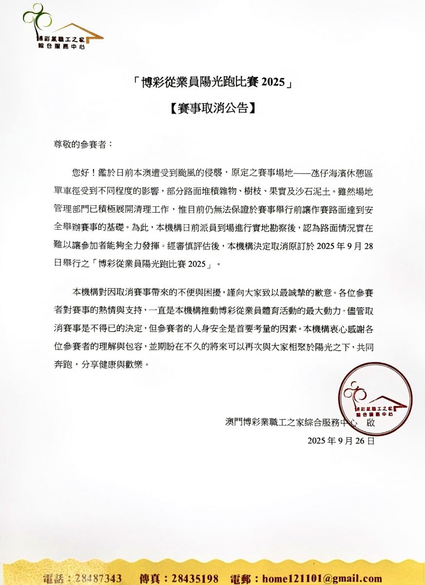 2025博彩從業員陽光跑比賽 -賽事取消公告