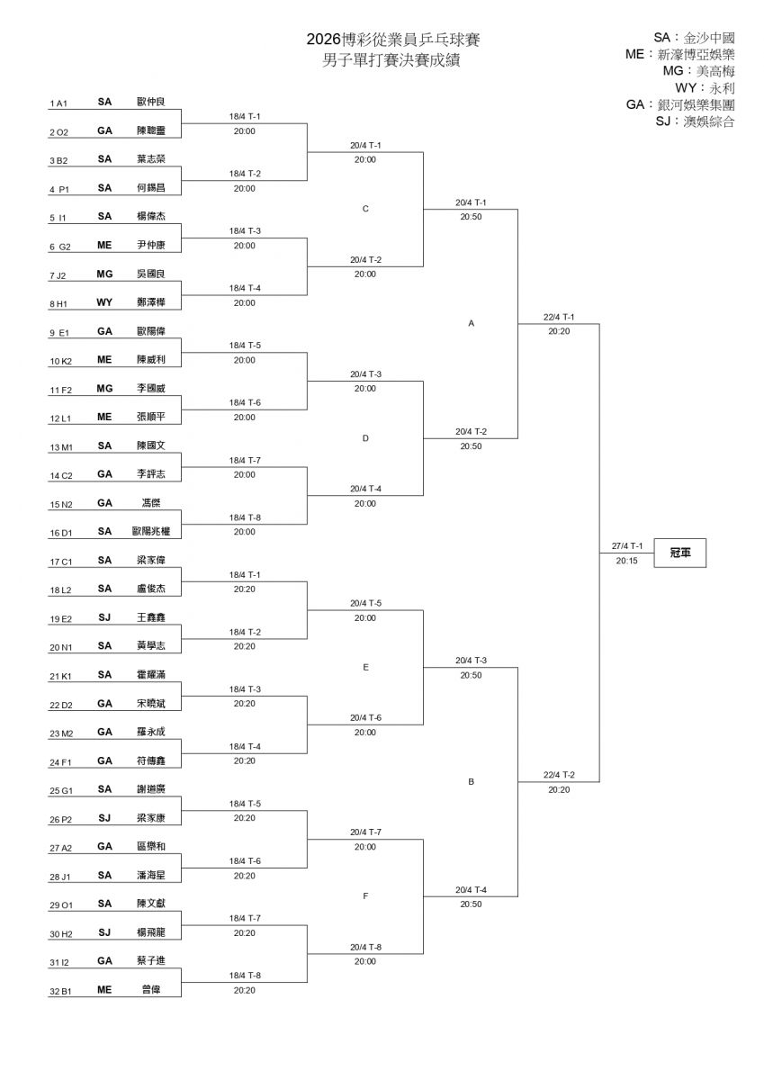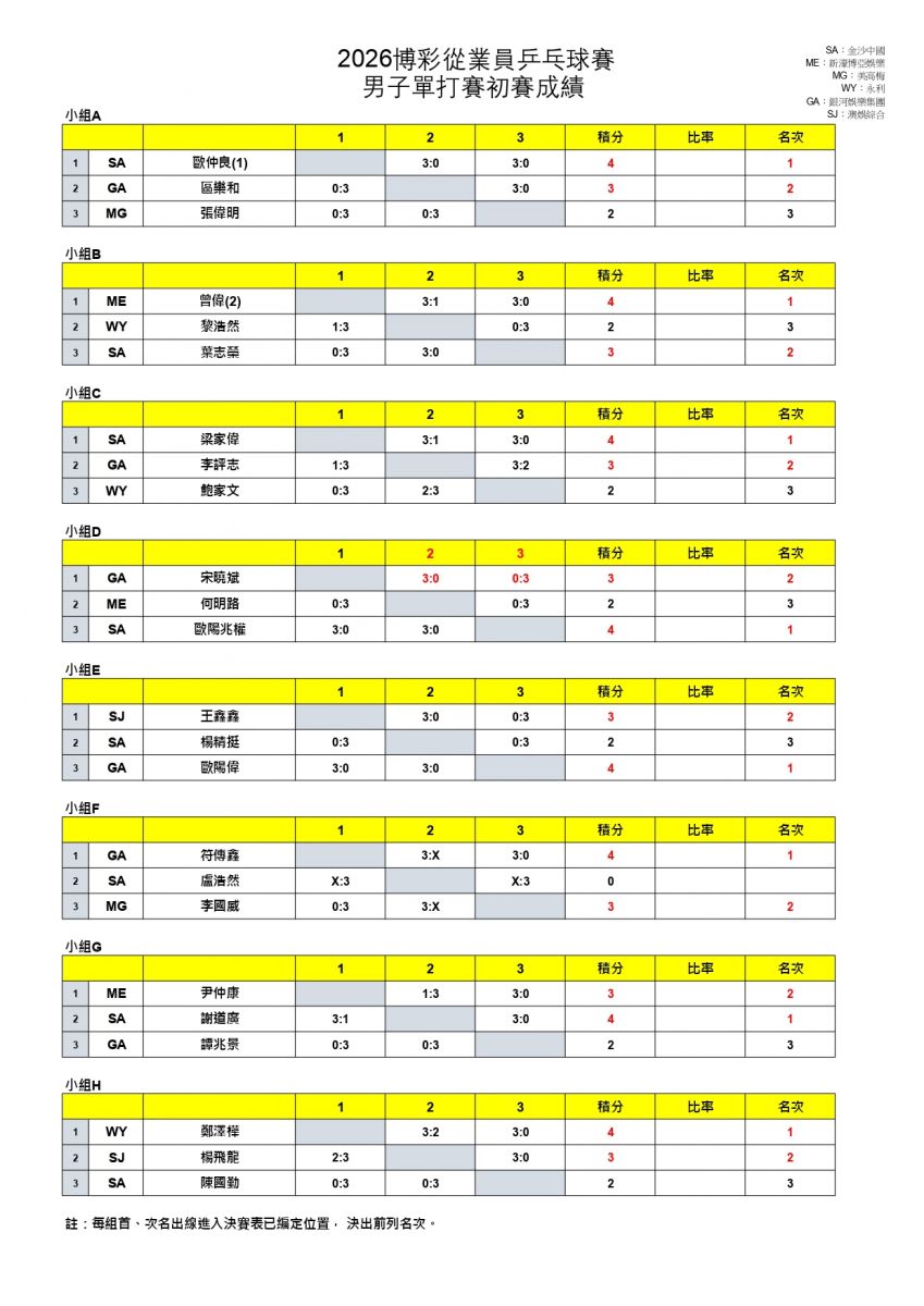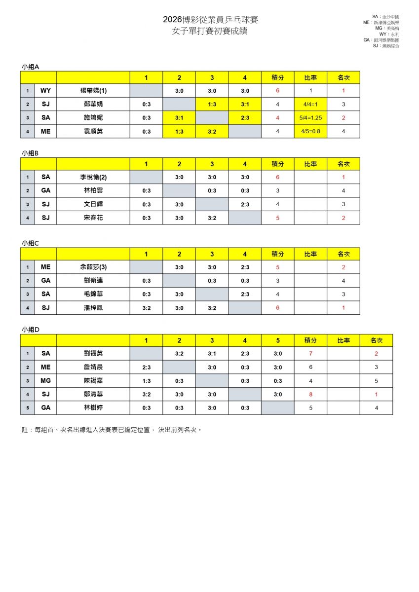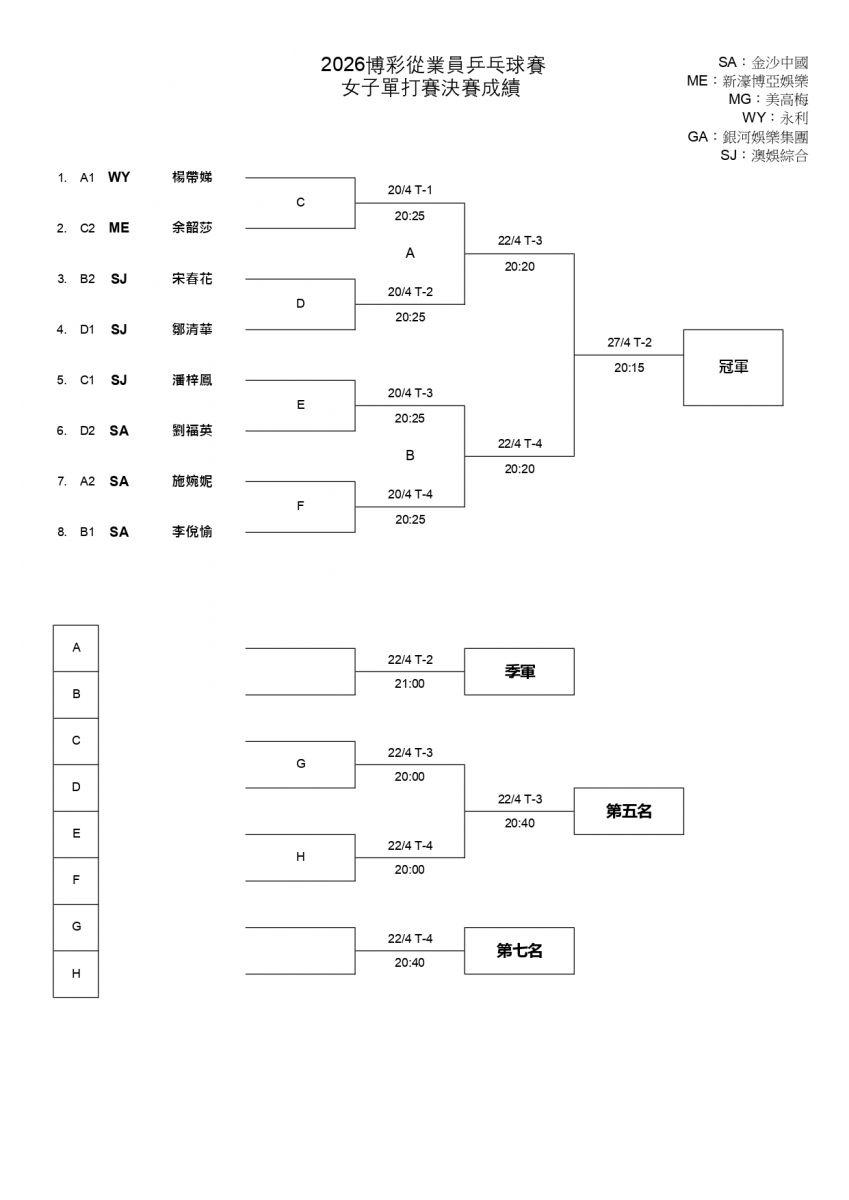 2026年度博彩從業員乒乓球賽賽程及賽果